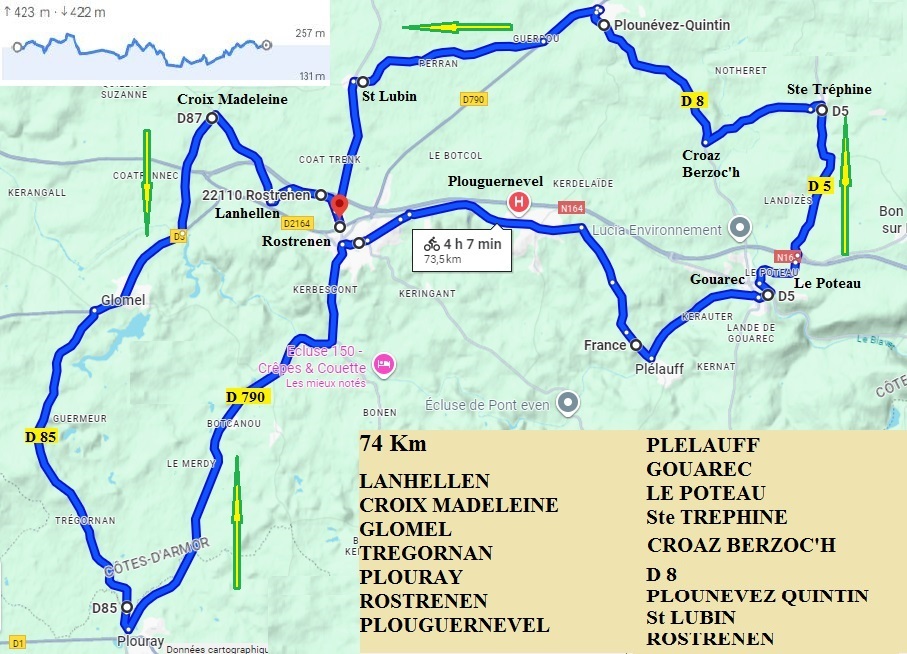 LANHELLEN – CROIX MADELEINE – GLOMEL – TREGORNAN – PLOURAY – ROSTRENEN – PLOUGUERNEVEL – PLELAUFF – GOUAREC – LE POTEAU – Ste TREPHINE – CROAZ BERZOC'H - D 8 – PLOUNEVEZ QUINTIN – St LUBIN - ROSTRENEN.