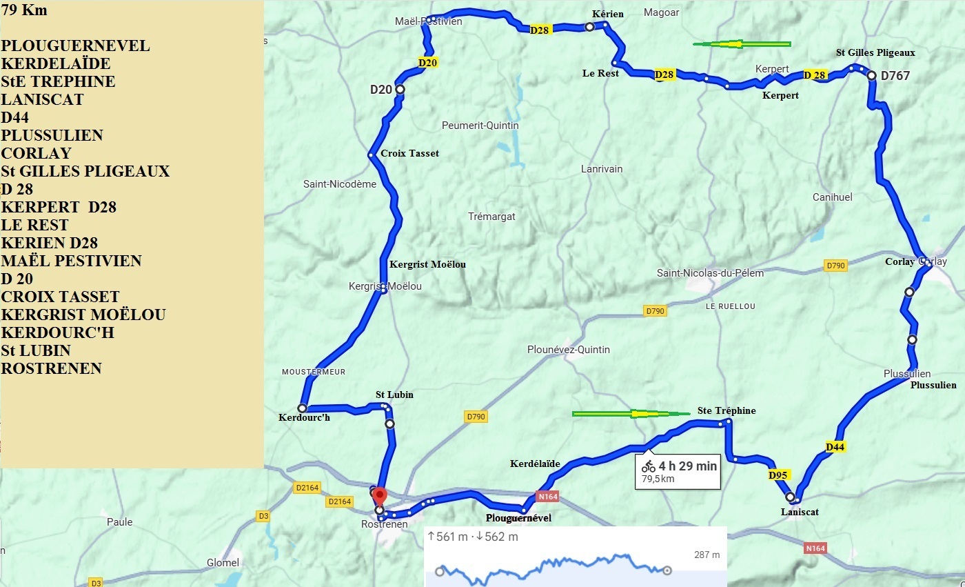 PLOUGUERNEVEL – KERDELAÏDE – StE TREPHINE – D95 – LANISCAT – D 44 – PLUSSULIEN – CORLAY – D 767 – St GILLES PLIGEAUX – D 28 – KERPERT – D 28 – LE REST – KERIEN – D28 – MAËL PESTIVIEN – D20 – CROIX TASSET – KERGRIST MOËLOU – KERDOURC'H _ St LUBIN – ROSTRENEN.