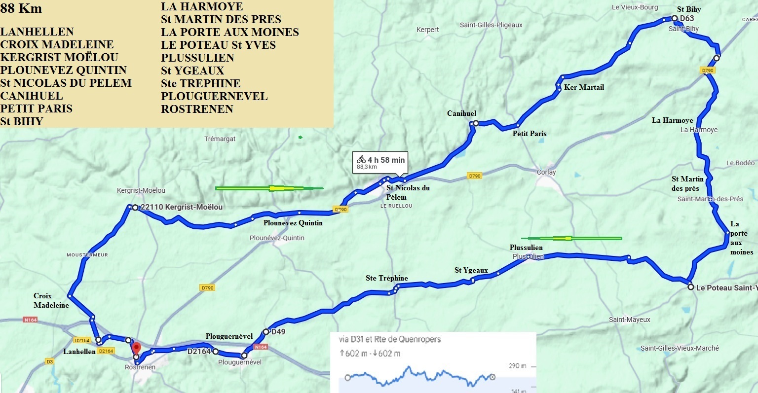 LANHELLEN – CROIX MADELEINE – KERGRISTMOËLOU – PLOUNEVEZ QUINTIN – St NICOLAS DU PELEM (centre) – CANIHUEL – PETIT PARIS – KER MARTAIL – St BIHY – LA HARMOYE – St MARTIN DES PRES – LAPORTE AUX MOINES – LE POTEAU St YVES – PLUSSULIEN – St YGEAUX – Ste TREPHINE - PLOUGUERNEVEL - ROSTRENEN.