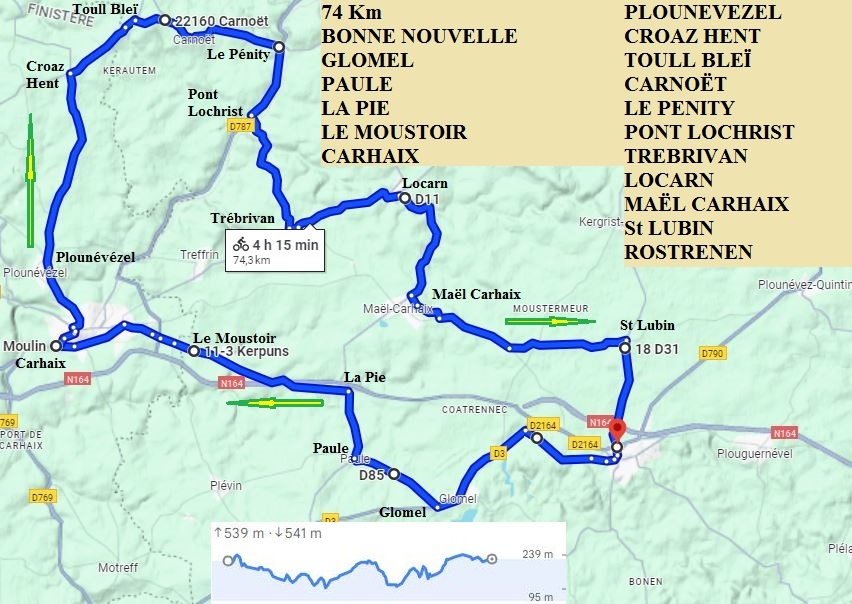 BONNE NOUVELLE – GLOMEL – PAULE – LA PIE – LE MOUSTOIR – CARHAIX (rocade) – PLOUNEVEZEL – CROAZ HENT – TOULL BLEÏ – CARNOËT – LE PENITY - PONT LOCHRIST – TREBRIVAN – LOCARN – MAËL CARHAIX – St LUBIN - ROSTRENEN.