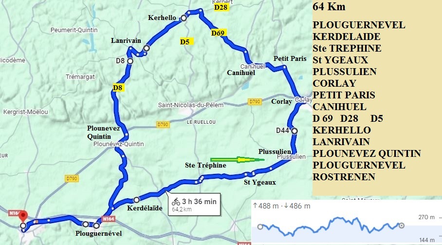 PLOUGUERNEVEL – KERDELAÏDE – Ste TREPHINE – St YGEAUX – PLUSSULIEN – CORLAY – PETIT PARIS – CANIHUEL – D 69 – D28 – D 5 – KERHELLO – LANRIVAIN – PLOUNEVEZ QUINTIN - PLOUGUERNEVEL – ROSTRENEN.