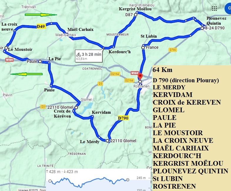 D790 (direction Plouray) – LE MERDY – KERVIDAM (prendre à gauche) – CROIX de KEREVEN – GLOMEL – PAULE – LA PIE – LE MOUSTOIR – LA CROIX NEUVE – D49 – MAËLCARHAIX – KERDOURC'H – KERGRIST MOËLOU – PLOUNEVEZ QUINTIN – St LUBIN - ROSTRENEN.