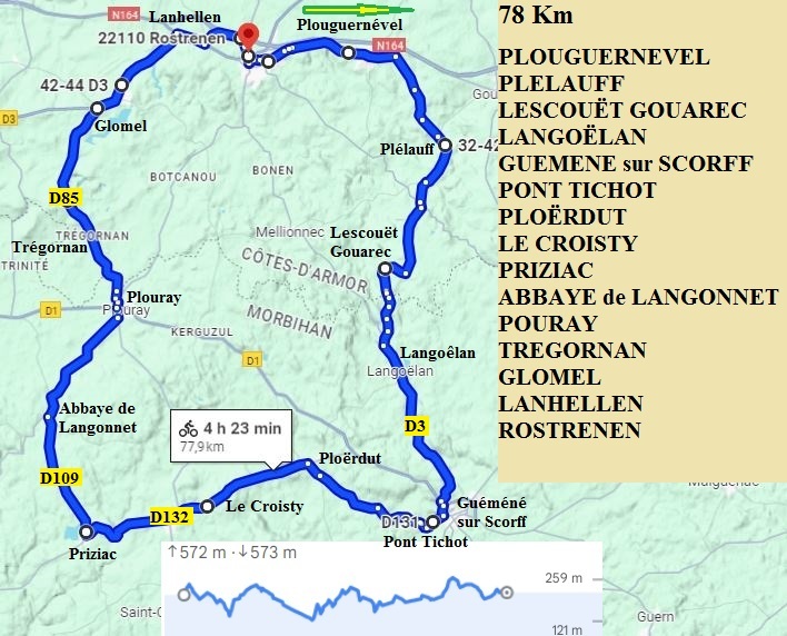 PLOUGUERNEVEL –PLELAUFF – LESCOUÊT GOUAREC – LANGOËLAN – GUEMENE / SCORFF – PONT TICHOT – PLOËRDUT – LE CROISTY – PRIZIAC – ABBAYE de LANGONNET – PLOURAY – TREGORNAN – GLOMEL – LANHELLEN - ROSTRENEN.