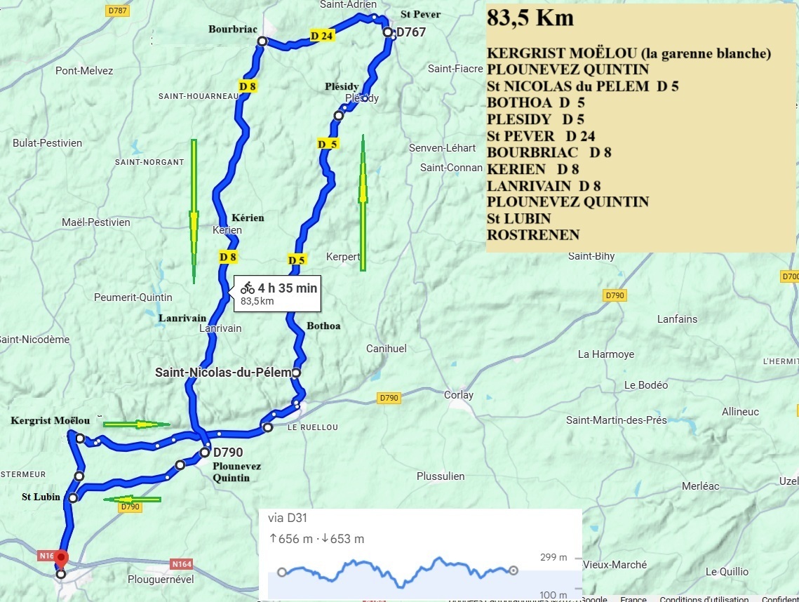 St LUBIN – KERGRIST MOËLOU – PLOUNEVEZ QUINTIN – St NICOLAS DU PELEM – BOTHOA – D5 – PLESIDY – D5 – St PEVER – D24 – BOURBRIAC – D8 – KERIEN – LANRIVAIN – PLOUNEVEZ QUINTIN – St LUBIN - ROSTRENEN.