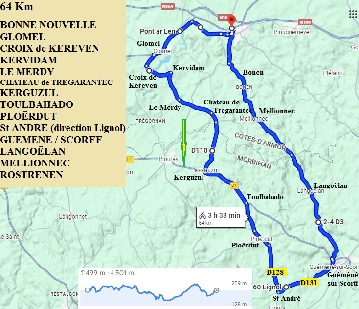 BONNE NOUVELLE – GLOMEL – CROIX DE KEREVEN – KERVIDAM- LE MERDY – CHATEAU DE TREGARANTEC – KERGUZUL – TOULBAHADO – PLOËRDUT – D 128 - St ANDRE ( direction Lignol) – D 131 – GUEMENE/SCORFF – LANGOËLAN – MELLIONNEC - BONEN – ROSTRENEN.