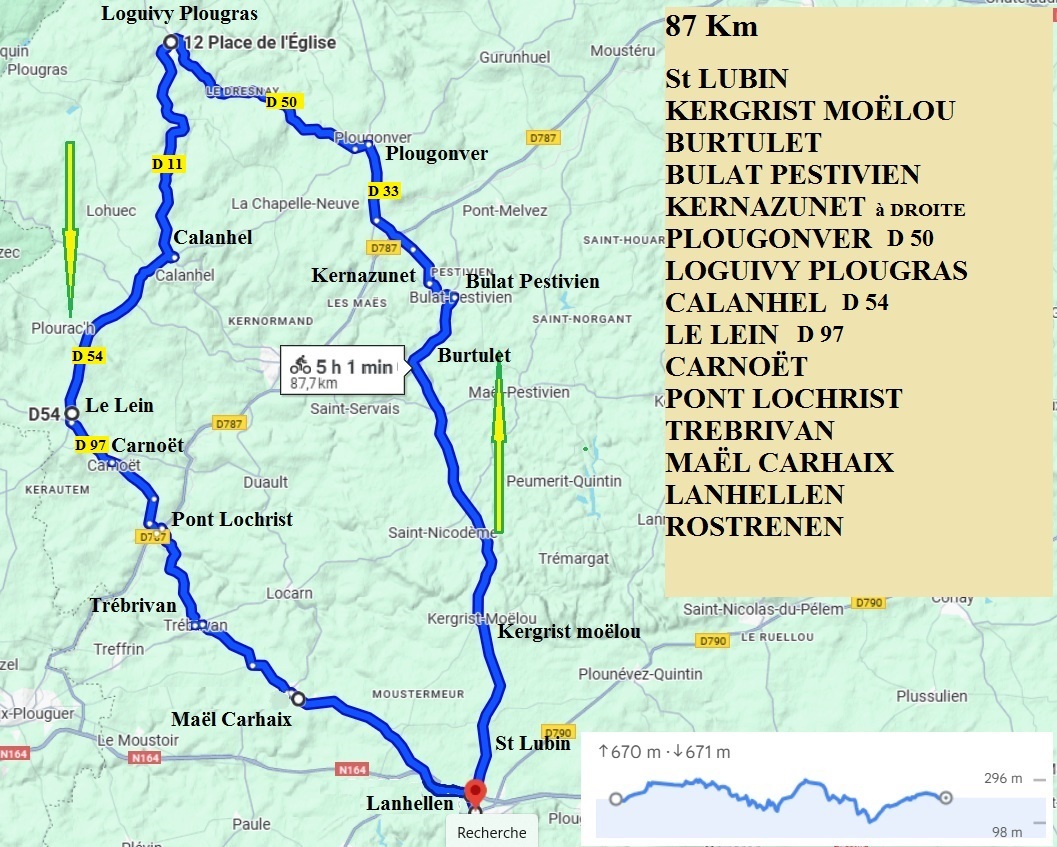 St LUBIN – KERGRIST MOËLOU – St NICODEME – BURTULET – BULAT PESTIVIEN – KERNAZUNET (à droite) - D 33 – PLOUGONVER – D 50 – LOGUIVY PLOUGRAS – D 11 – CALANHEL – D 54 – LE LEIN – D 97 – CARNOËT – PONT LOCHRIST – TREBRIVAN – MAËL CARHAIX – LANHELLEN - ROSTRENEN.