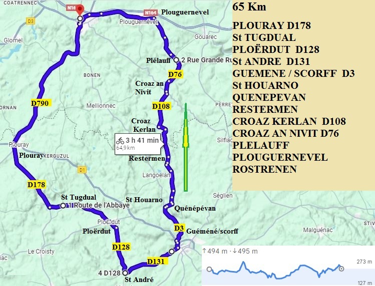 PLOURAY – D178 – St TUGDUAL – PLOËRDUT – D128 – St ANDRE – D131 – GUEMENE/SCORFF – D3 – St HOUARNO (à droite) – QUENEPEVAN – RESTERMEN- CROAZ KERLAN – D108 – CROAZ AN NIVIT – PLELAUFF - PLOUGUERNEVEL - ROSTRENEN.