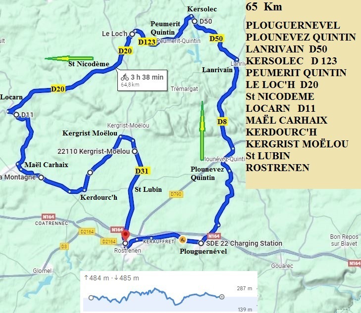 PLOUGUERNEVEL – PLOUNEVEZ QUINTIN – LANRIVAIN – D50 -KERSOLEC – D123 – PEUMERIT QUINTIN – LE LOC'H – D20 – St NICODEME – LOCARN – MAËL CARHAIX – KERDOURC'H – KERGRIST MOËLOU – St LUBIN - ROSTRENEN.