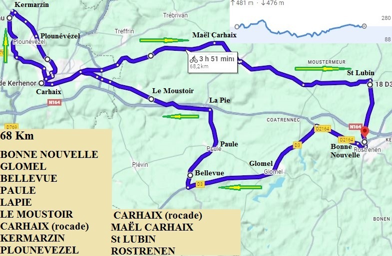 BONNE NOUVELLE – GLOMEL – BELLE VUE – PAULE – LA PIE – LE MOUSTOIR – CARHAIX (rocade) – KERMARZIN – PLOUNEVEZEL – CARHAIX (rocade) – MAËL CARHAIX – St LUBIN - ROSTRENEN.