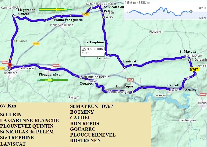 St LUBIN – LA GARENNE BLANCHE – PLOUNEVEZ QUINTIN – St NICOLAS du PELEM – Ste TREPHINE – TROZULON – LANISCAT – St MAYEUX – D 767 – BOT MINY – CAUREL – BON REPOS – GOUAREC – PLOUGUERNEVEL - ROSTRENEN.